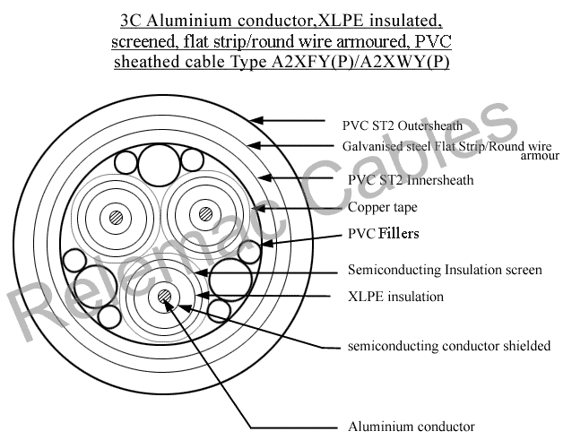 XLPE Cables >> Three Core Copper/Aluminium Conductor XLPE Insulated extended / taped PVC Inner Sheath Cables, Flat Strip Armoured A2XFY (P/T). Cables are available with both Taped(T) and extended PVC (P) inner sheath as per customer requirements.