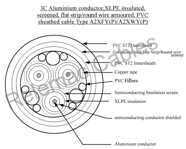 XLPE Cables >> Three Core Copper/Aluminium Conductor XLPE Insulated extended / taped PVC Inner Sheath Cables, Flat Strip Armoured A2XFY (P/T). Cables are available with both Taped(T) and extended PVC (P) inner sheath as per customer requirements.