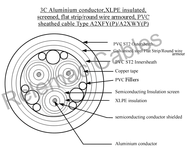 XLPE Cables >> Three Core Copper/Aluminium Conductor XLPE Insulated extended / taped PVC Inner Sheath Cables, Flat Strip Armoured A2XFY (P/T). Cables are available with both Taped(T) and extended PVC (P) inner sheath as per customer requirements.