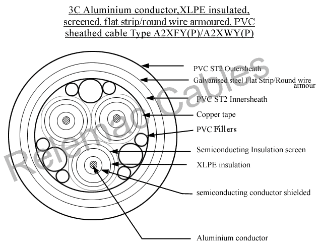 XLPE Cables >> Three Core Copper/Aluminium Conductor XLPE Insulated extended / taped PVC Inner Sheath Cables, Flat Strip Armoured A2XFY (P/T). Cables are available with both Taped(T) and extended PVC (P) inner sheath as per customer requirements.